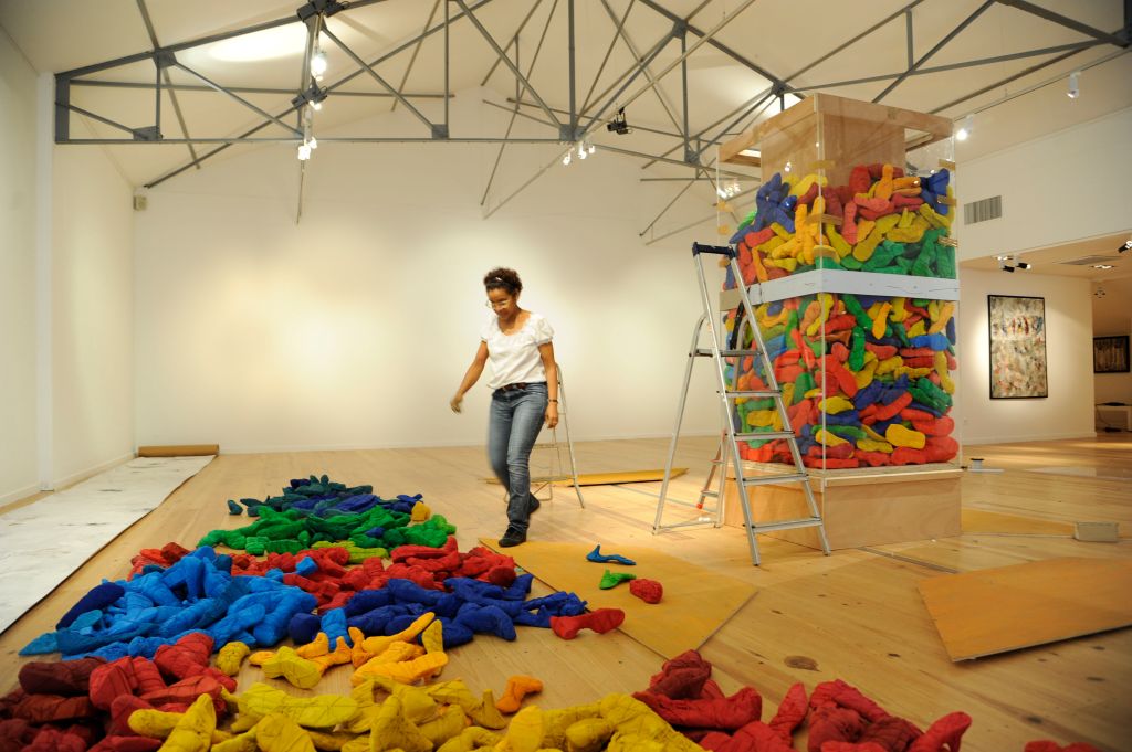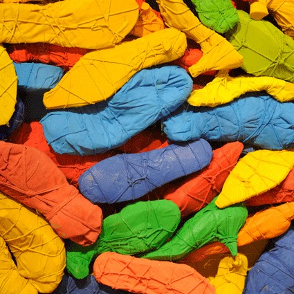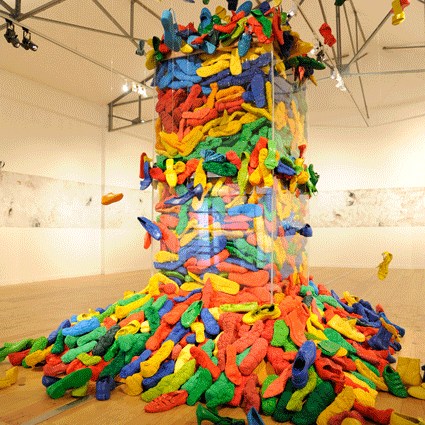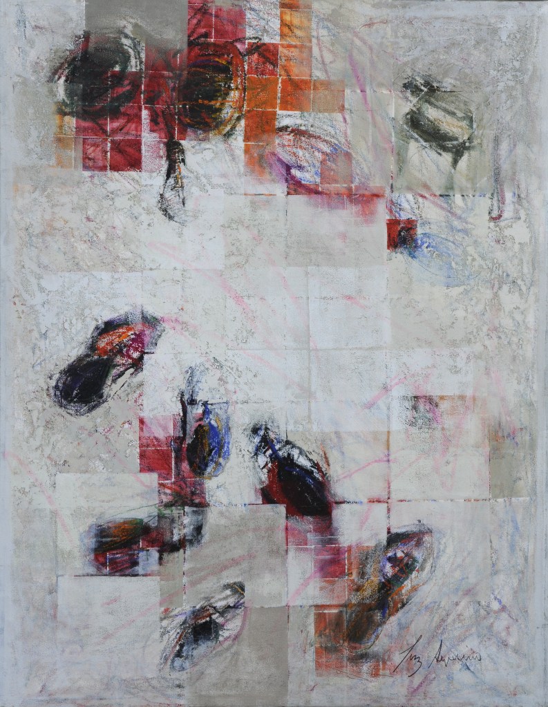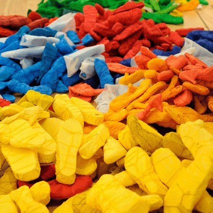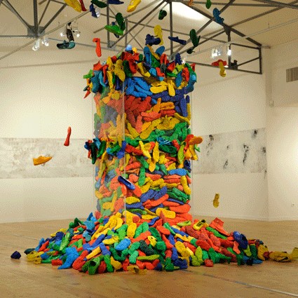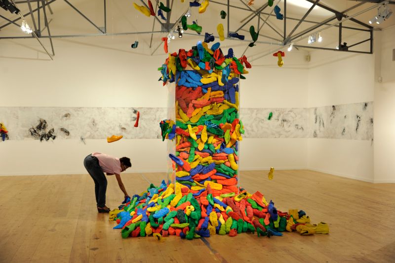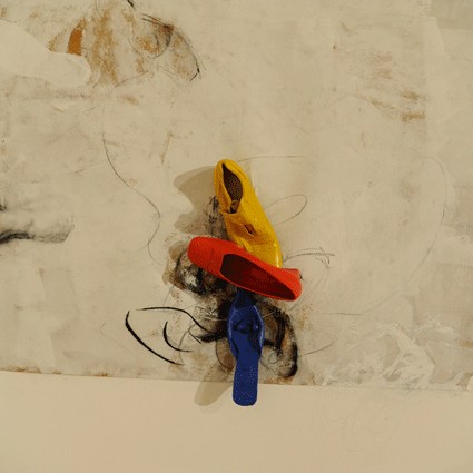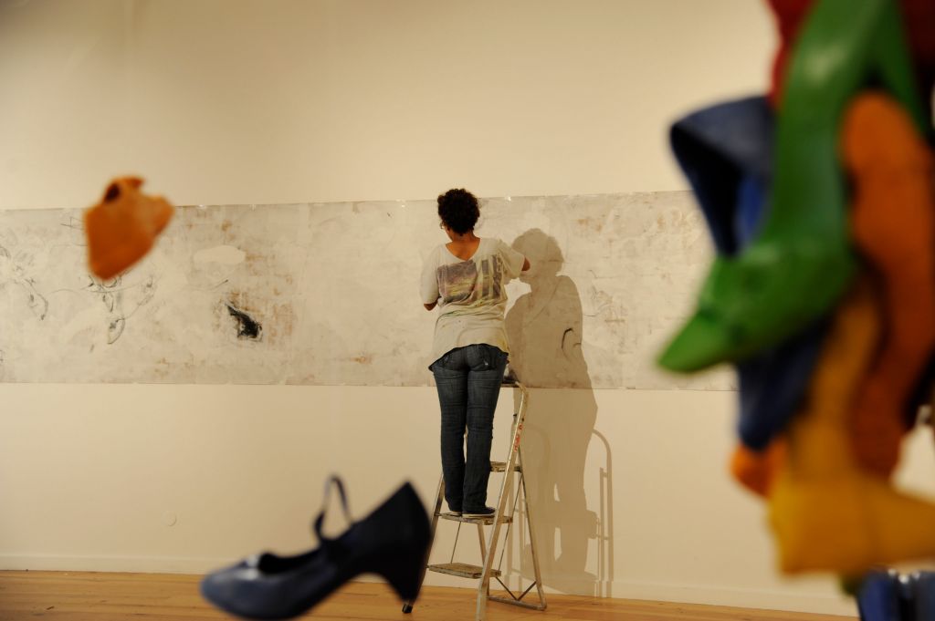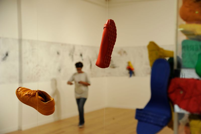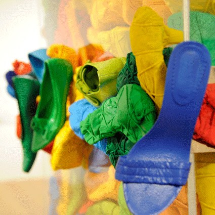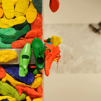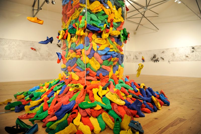 L’installation déplace quant à elle cette préoccupation de la série picturale dans un espace que l’artiste explore depuis peu. Dans ce cas précis, Luz Severino fait référence à cette absence de liberté d’expression qu’on retrouve dans une grande partie du monde, mais qui, comme c’est souvent le cas dans les oeuvres de Luz, transcende cette question précise et se métamorphose cette fois-ci en une instabilité pleine de sens, comme dans un projet d’avenir érigé à la gloire de la poésie. Un rassemblement de chaussures nouées entre elles en un édifice instable : son caractère intérieur, son aura de protection, sont conditionnés par le fait qu’elles sont inutilisables, par l’annulation de leur fonction.