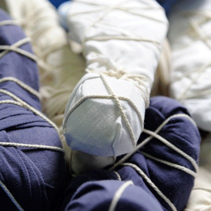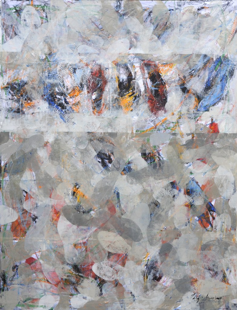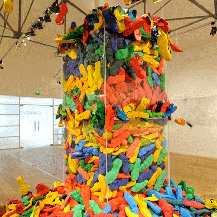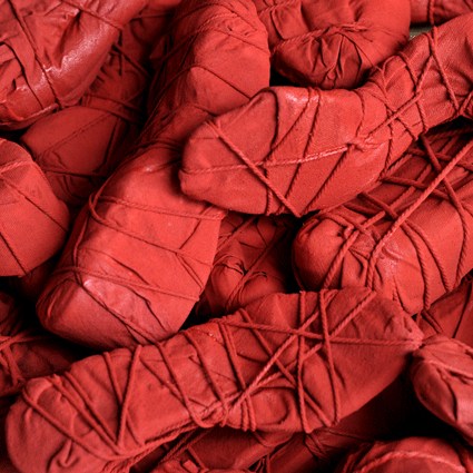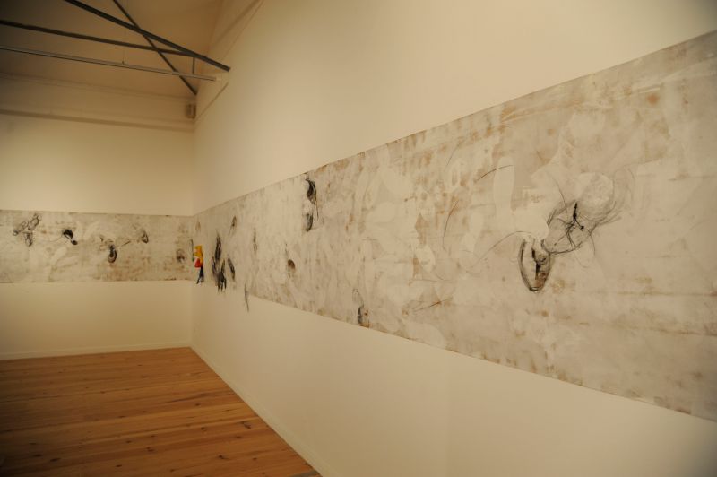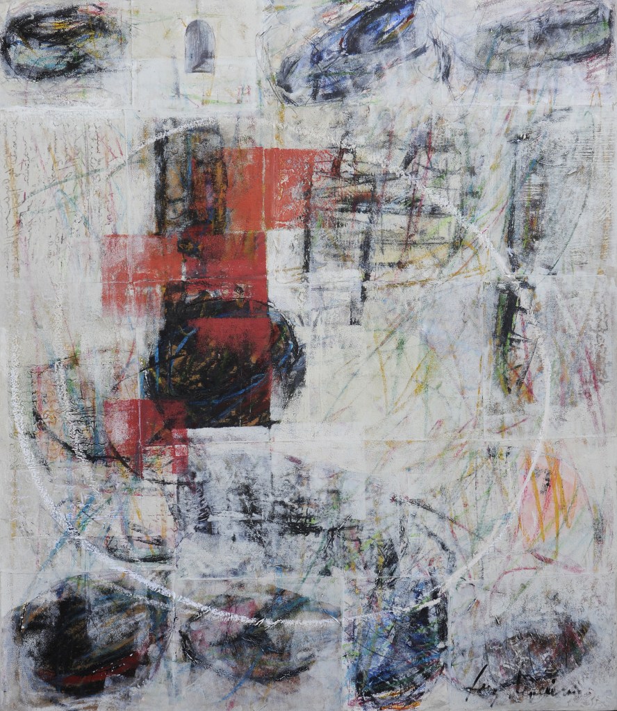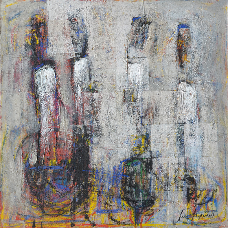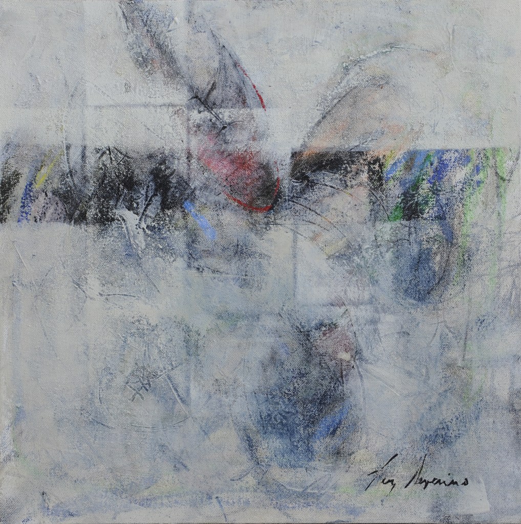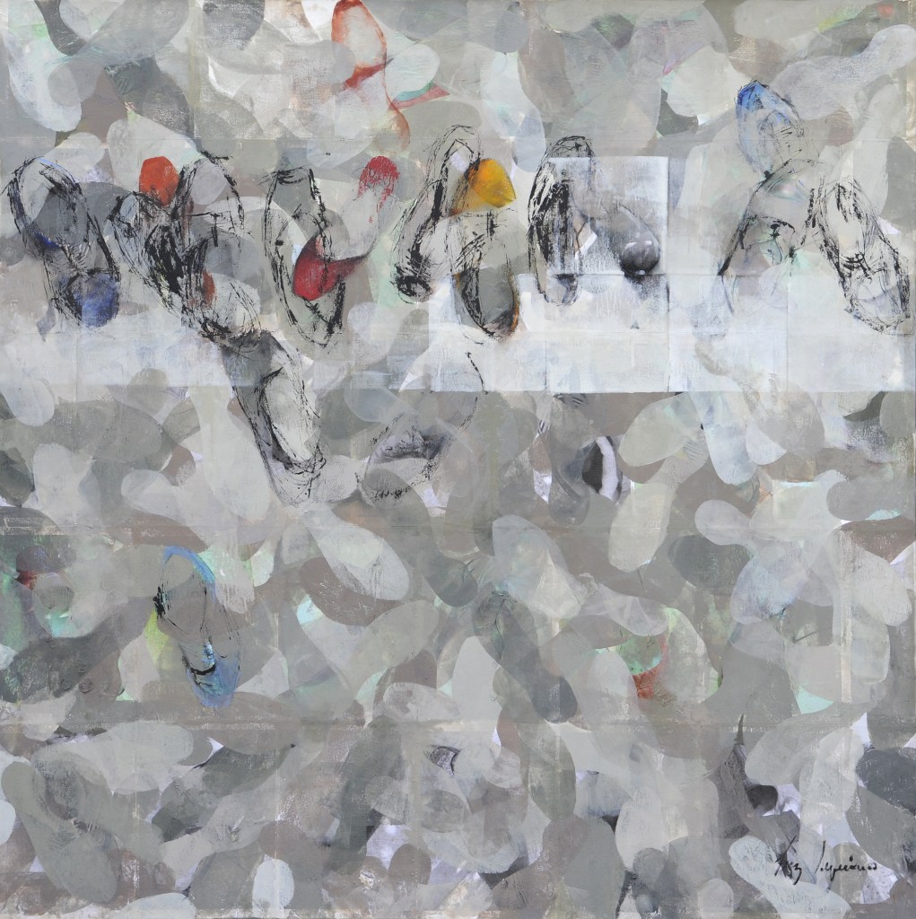 L’installation déplace quant à elle cette préoccupation de la série picturale dans un espace que l’artiste explore depuis peu. Dans ce cas précis, Luz Severino fait référence à cette absence de liberté d’expression qu’on retrouve dans une grande partie du monde, mais qui, comme c’est souvent le cas dans les oeuvres de Luz, transcende cette question précise et se métamorphose cette fois-ci en une instabilité pleine de sens, comme dans un projet d’avenir érigé à la gloire de la poésie. Un rassemblement de chaussures nouées entre elles en un édifice instable : son caractère intérieur, son aura de protection, sont conditionnés par le fait qu’elles sont inutilisables, par l’annulation de leur fonction.