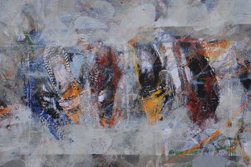 Les oeuvres picturales qui composent cette exposition s’annoncent comme une intention, un projet de fuite en avant, qui de par son inclination parvient à s’installer encore plus dans la réalité du moment.