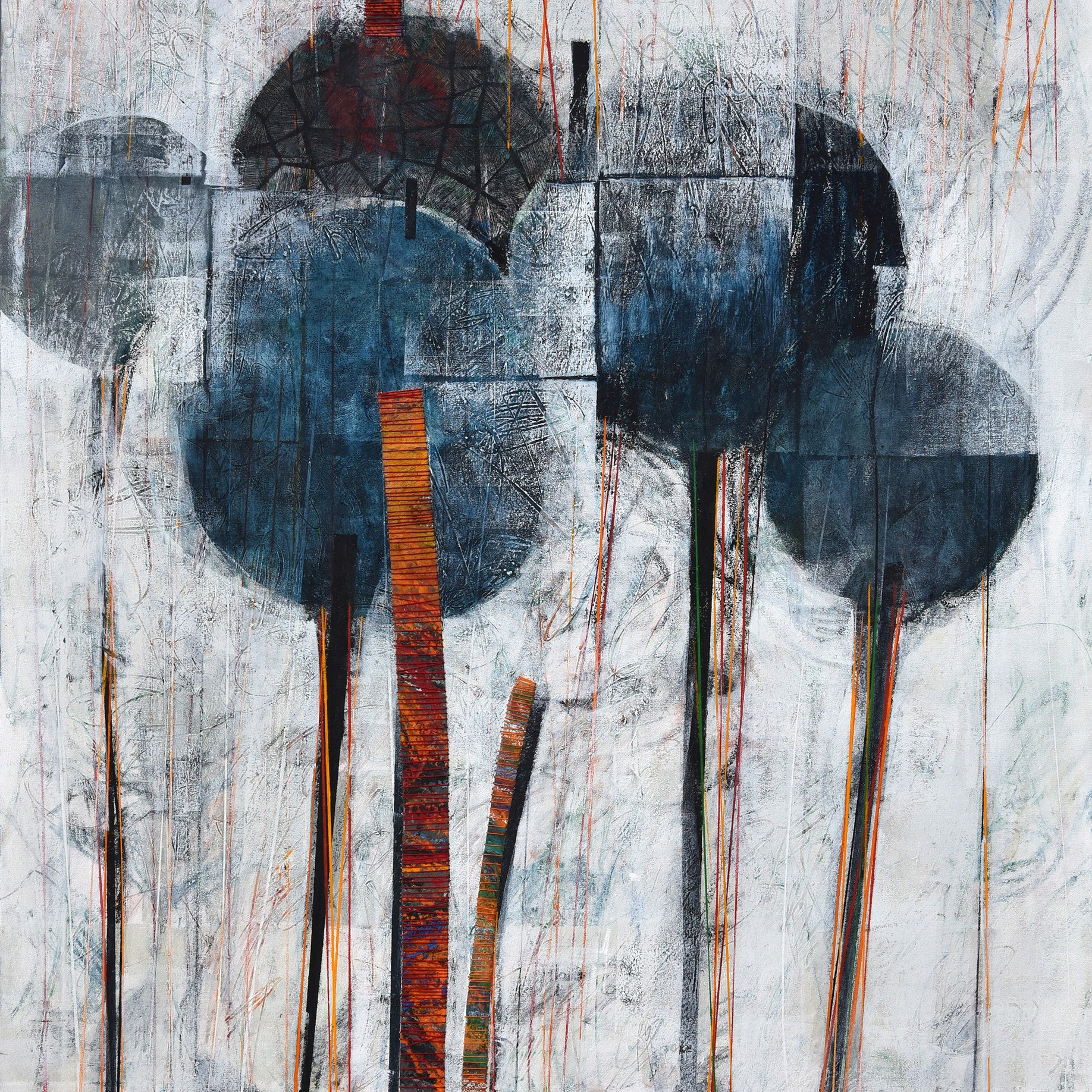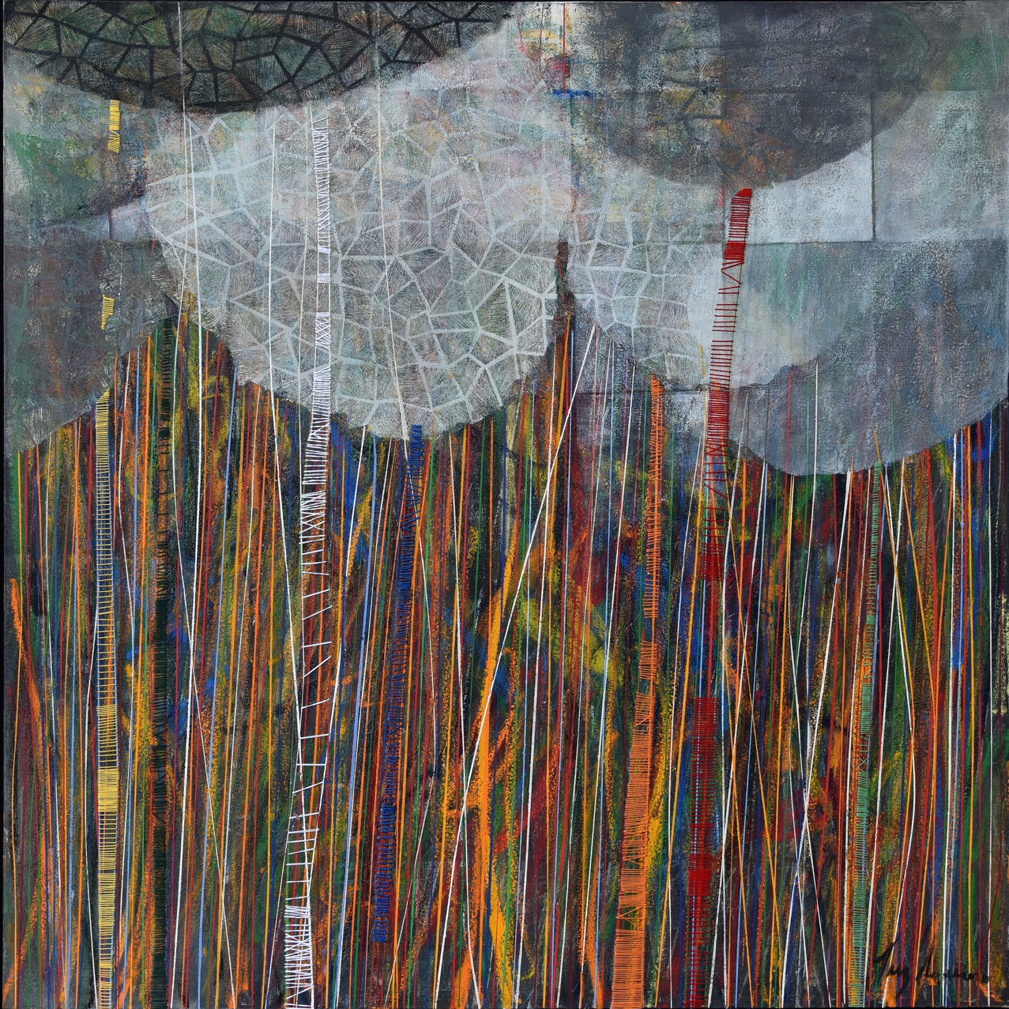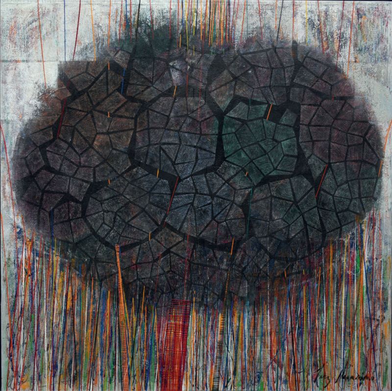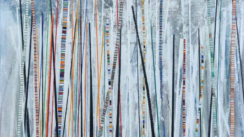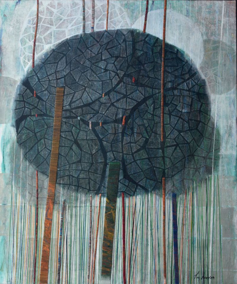 Dans l’exposition, nous découvrons avec ces quatre toiles, un dispositif créatif tout à fait original. Luz Severino représente les tonalités des saisons des arbres et leurs feuillages juchés sur de fins troncs qui sont couverts avec des rythmes réguliers de fils de couleurs. L’artiste, patiemment, coud le verso de la toile et donne ainsi une rythmique colorée aux troncs des arbres. En étroite relation avec les tiges de l’installation, ces fils de diverses couleurs font écho aux tonalités de la forêt, des feuillages et des fleurs de toutes végétations que l’on retrouve dans la nature. Autre particularité technique très intéressante et surprenante, est la façon dont l’artiste compose le feuillage touffu des arbres.