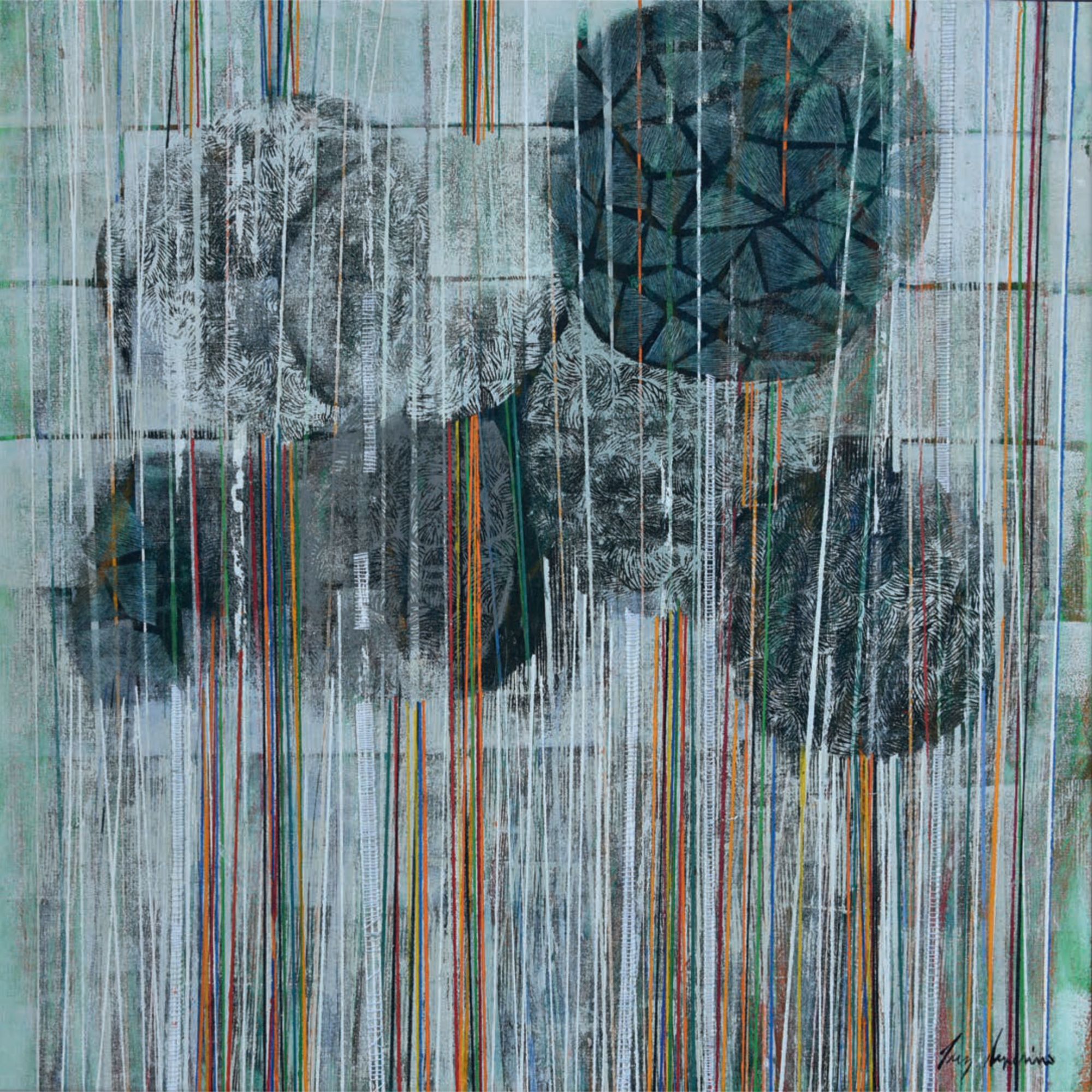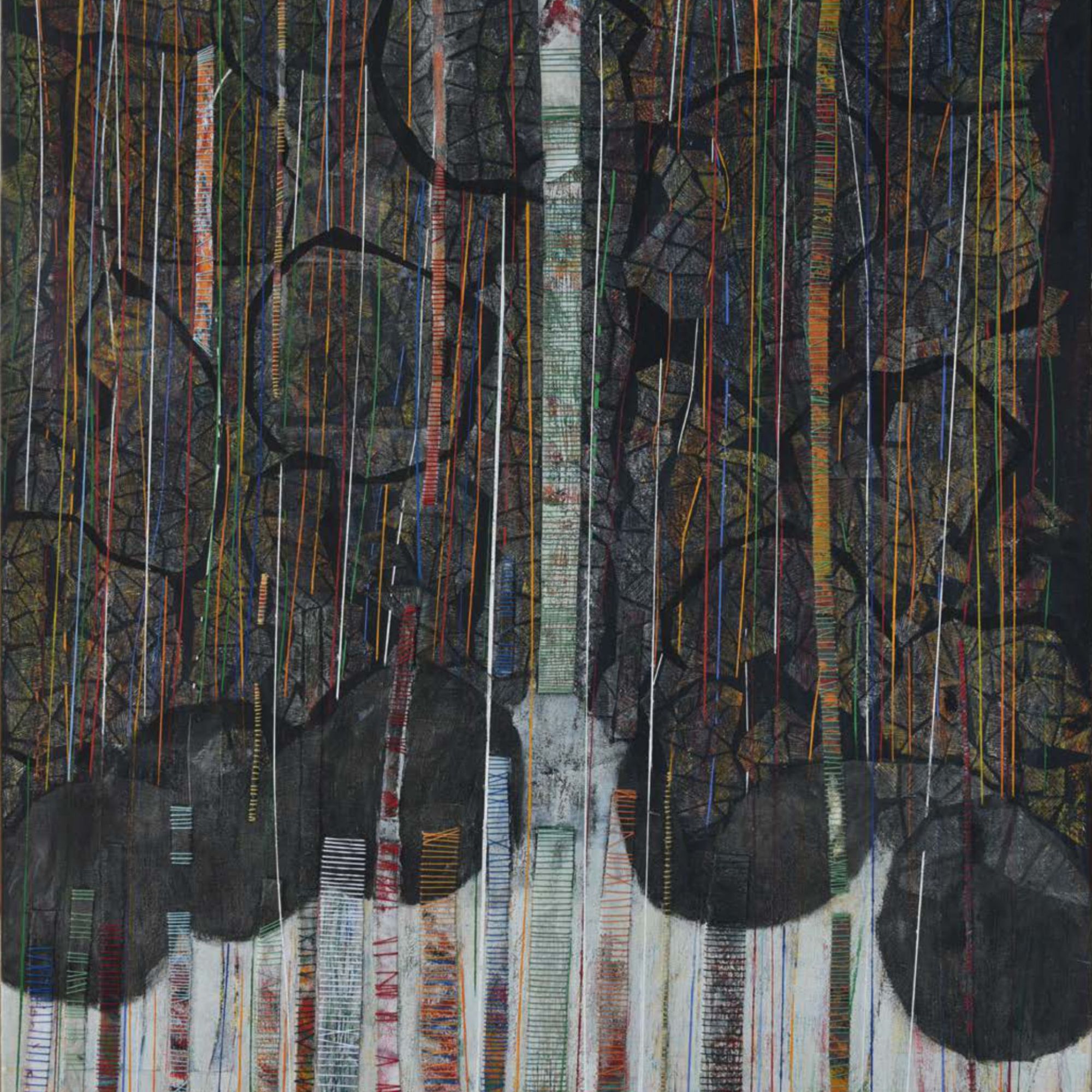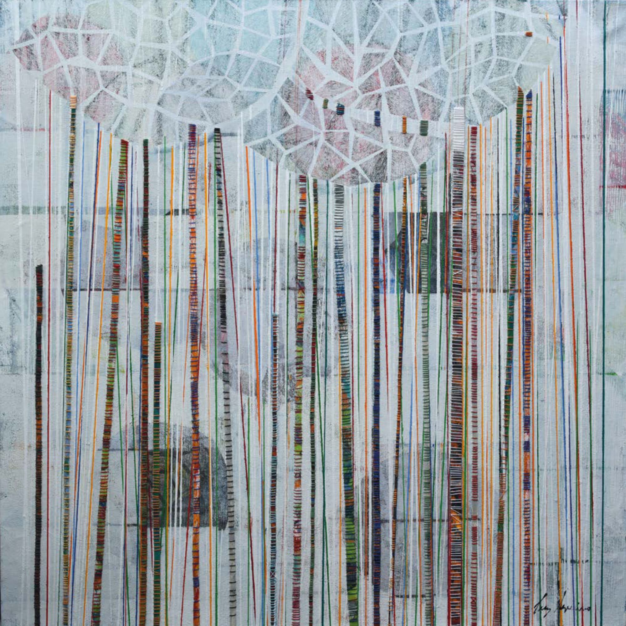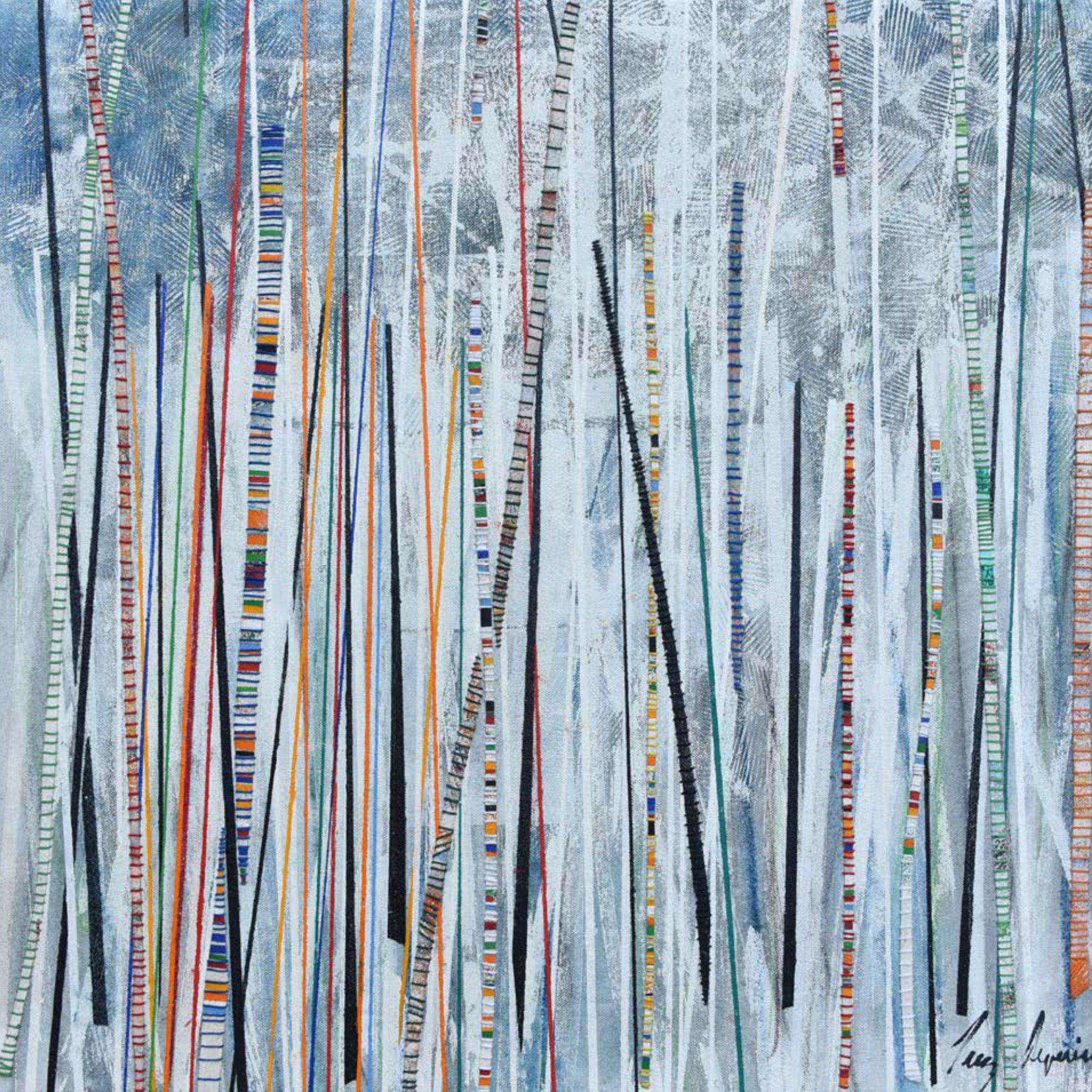 Arrêtons-nous un instant sur la façon dont Luz Severino travaille ses grands tableaux. Elle trace et peint des structures verticales que l’on retrouve dans de nombreuses séries de ses œuvres ultérieures qui représentaient principalement des figures, voire des personnages. Ici, ces verticales ponctuent toute la surface des tableaux et engagent le regard vers un rythme perceptif proche de l’Op art ou de l’Art cinétique. Entourés de fils de couleurs, ces sortes de tiges et de troncs d’arbres se meuvent et oblitèrent l’arrière fond de la peinture qui le plus fréquemment représente des arbres touffus.