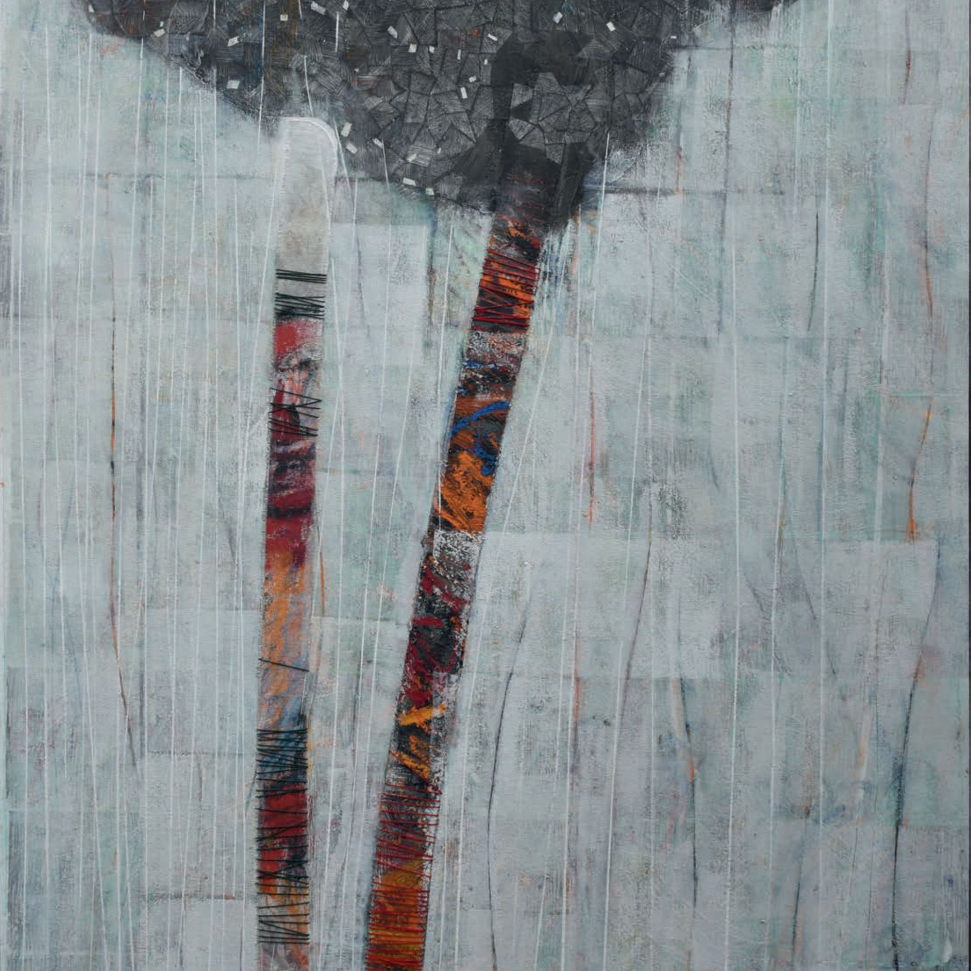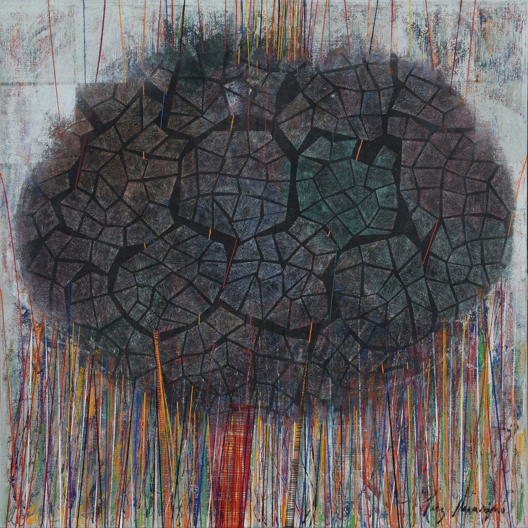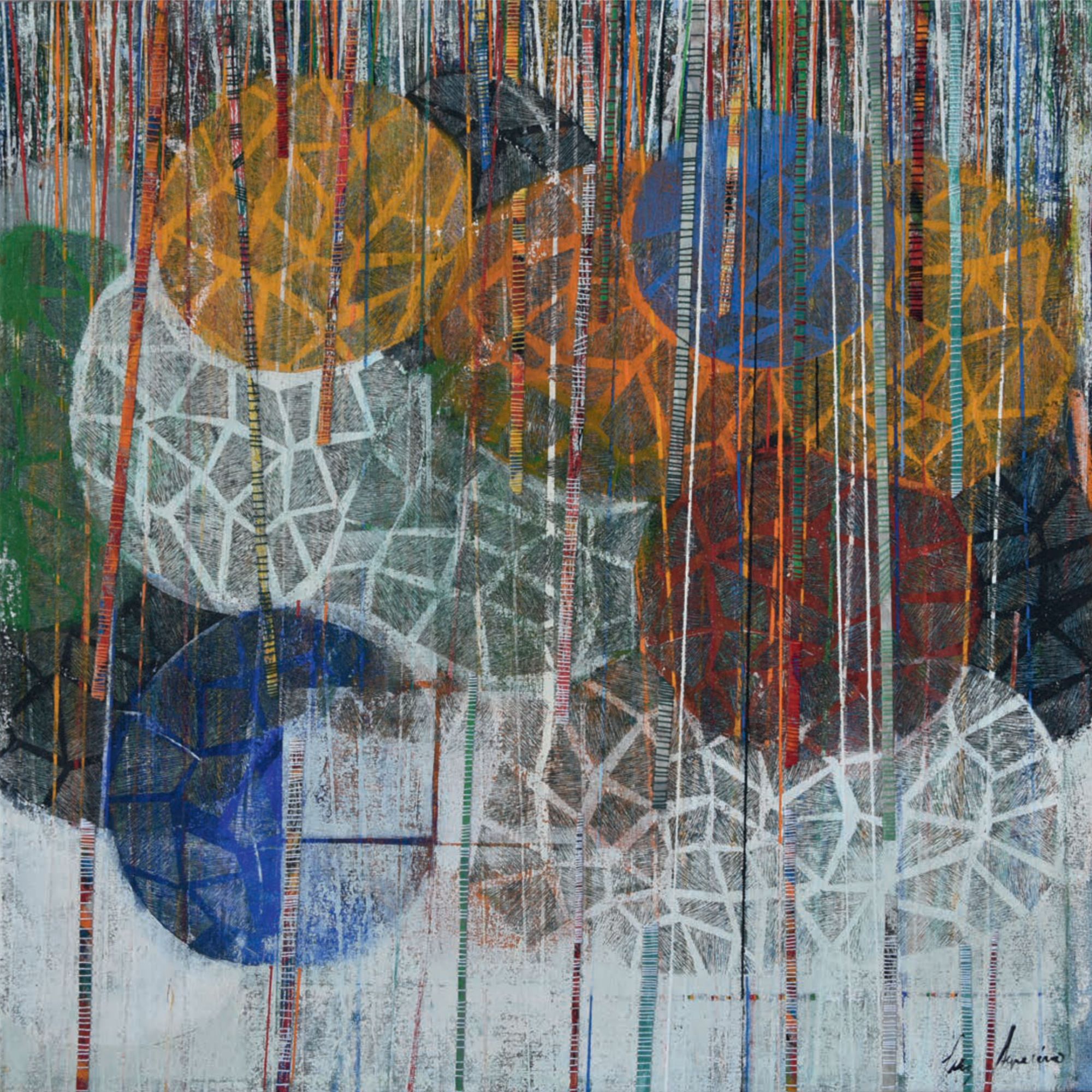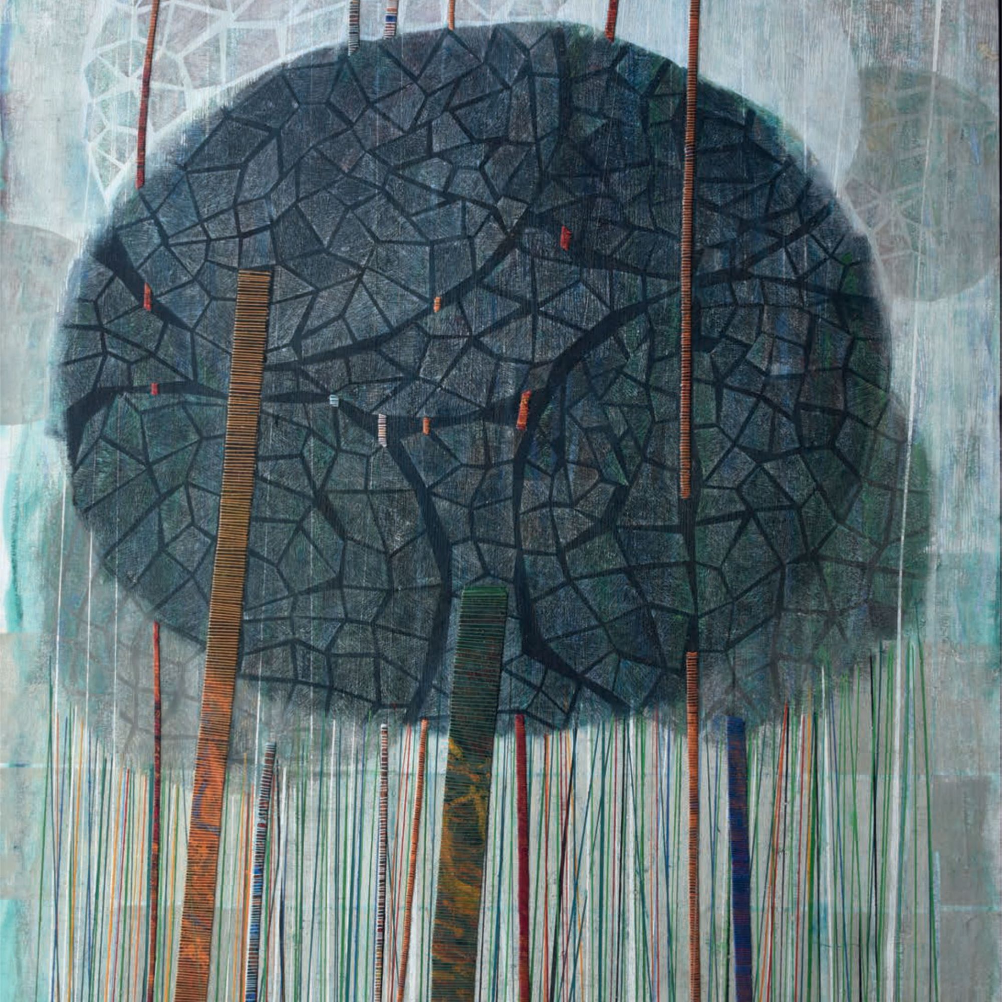 Arrêtons-nous un instant sur la façon dont Luz Severino travaille ses grands tableaux. Elle trace et peint des structures verticales que l’on retrouve dans de nombreuses séries de ses œuvres ultérieures qui représentaient principalement des figures, voire des personnages. Ici, ces verticales ponctuent toute la surface des tableaux et engagent le regard vers un rythme perceptif proche de l’Op art ou de l’Art cinétique. Entourés de fils de couleurs, ces sortes de tiges et de troncs d’arbres se meuvent et oblitèrent l’arrière fond de la peinture qui le plus fréquemment représente des arbres touffus.