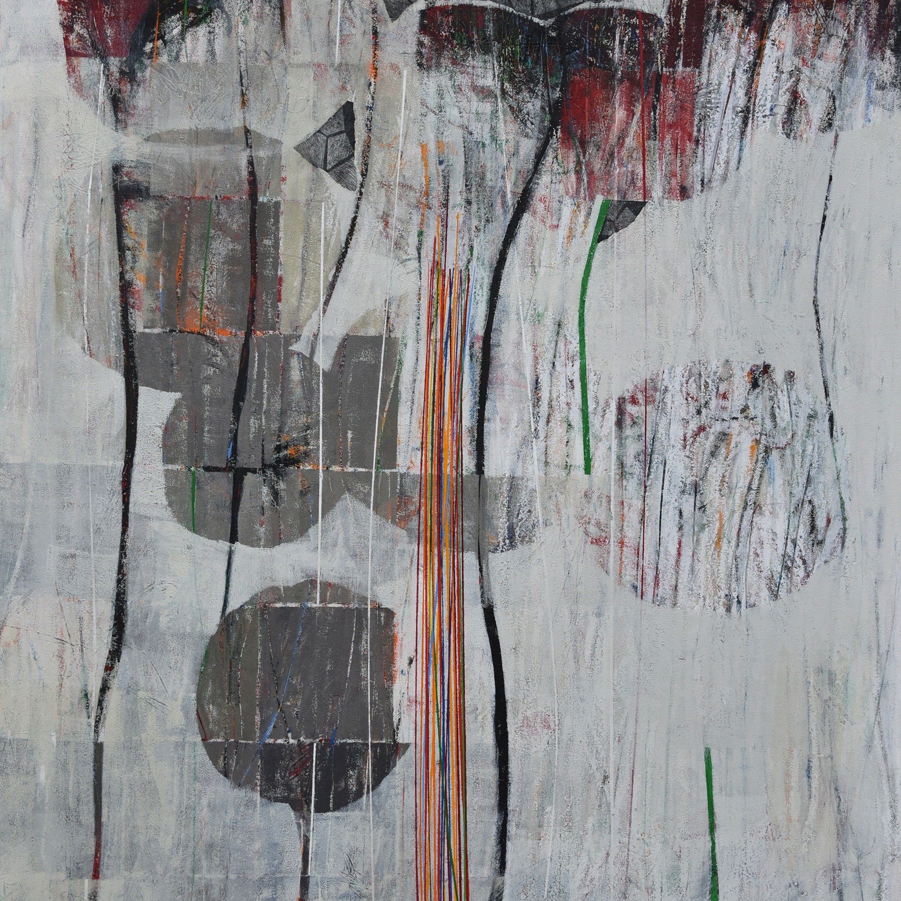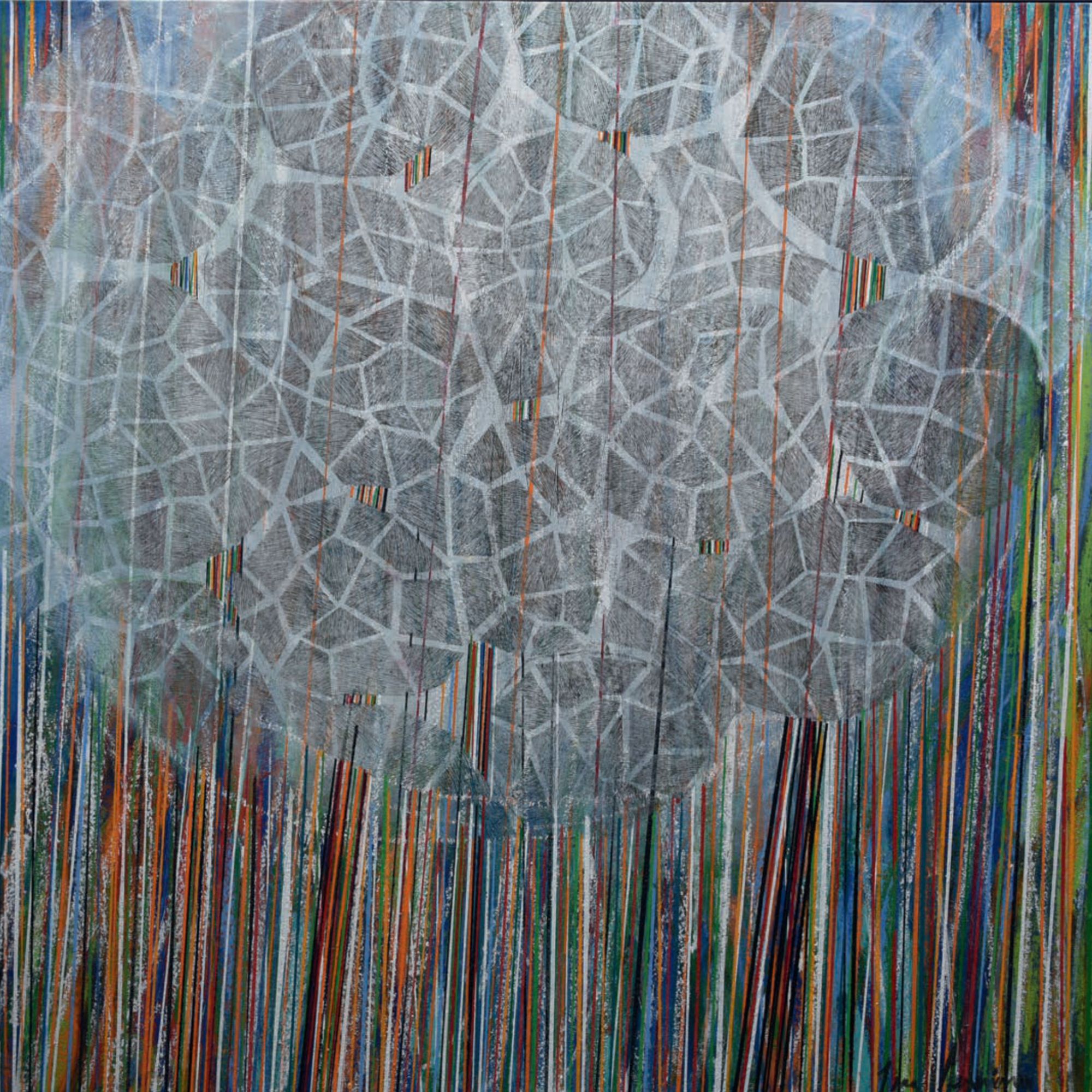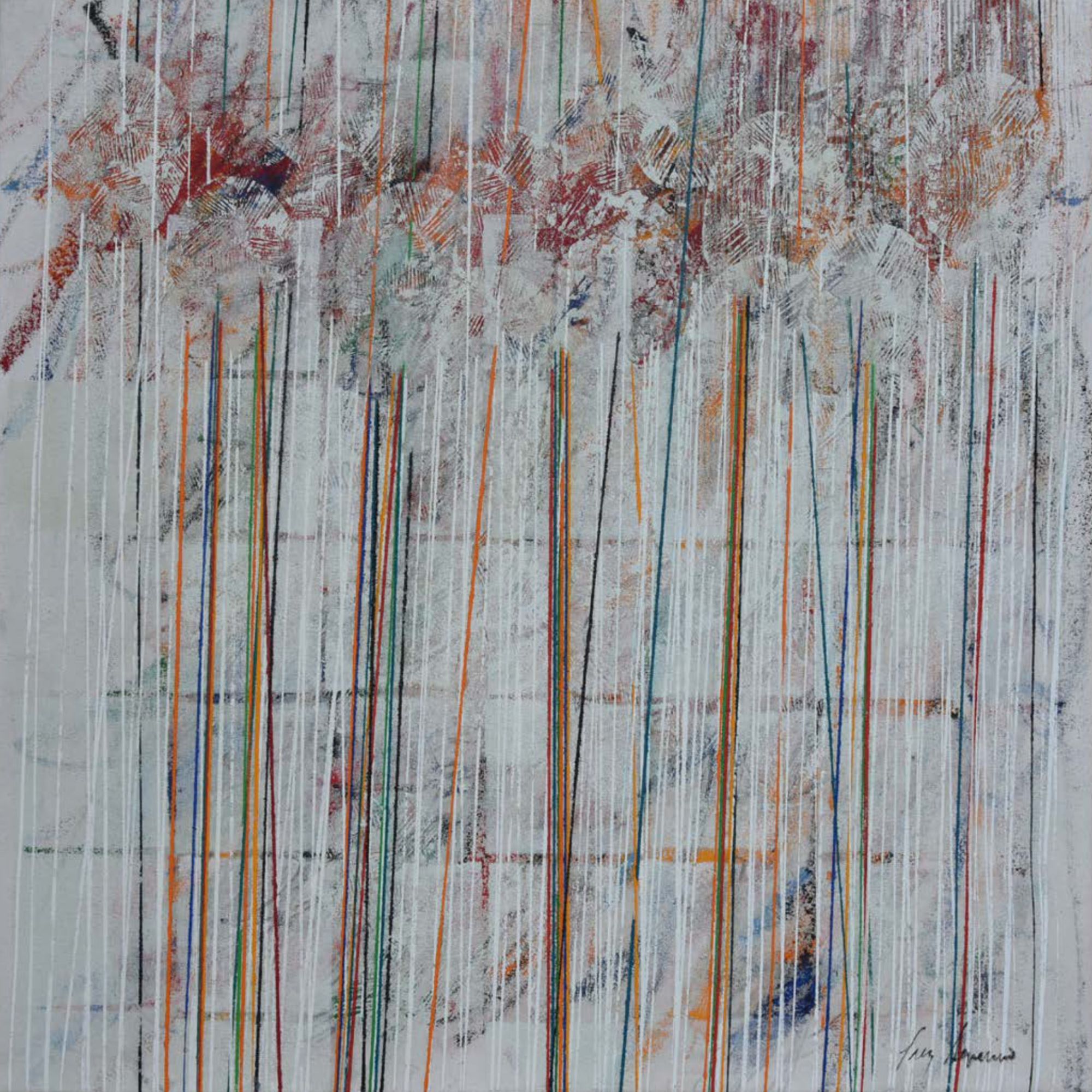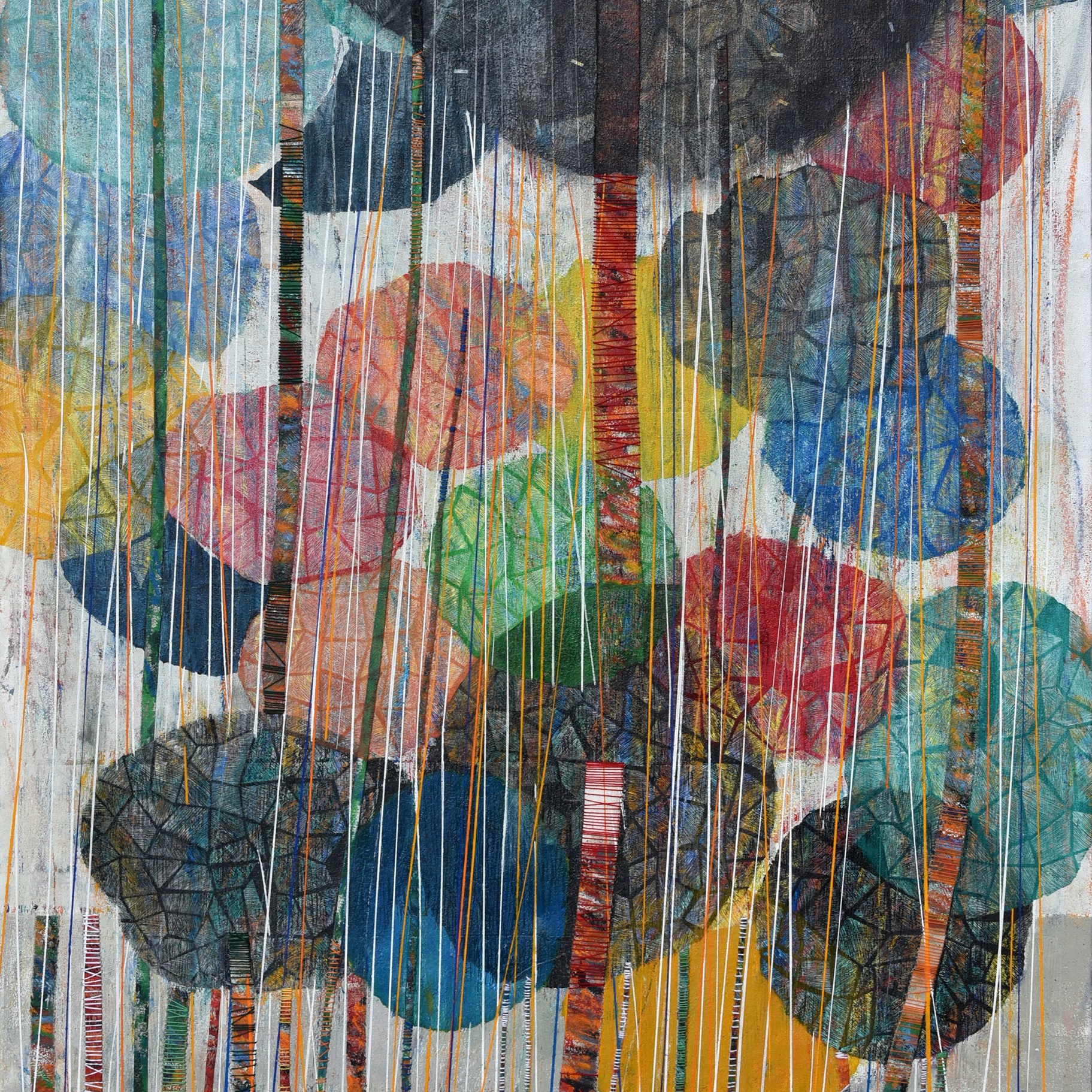 Arrêtons-nous un instant sur la façon dont Luz Severino travaille ses grands tableaux. Elle trace et peint des structures verticales que l’on retrouve dans de nombreuses séries de ses œuvres ultérieures qui représentaient principalement des figures, voire des personnages. Ici, ces verticales ponctuent toute la surface des tableaux et engagent le regard vers un rythme perceptif proche de l’Op art ou de l’Art cinétique. Entourés de fils de couleurs, ces sortes de tiges et de troncs d’arbres se meuvent et oblitèrent l’arrière fond de la peinture qui le plus fréquemment représente des arbres touffus.