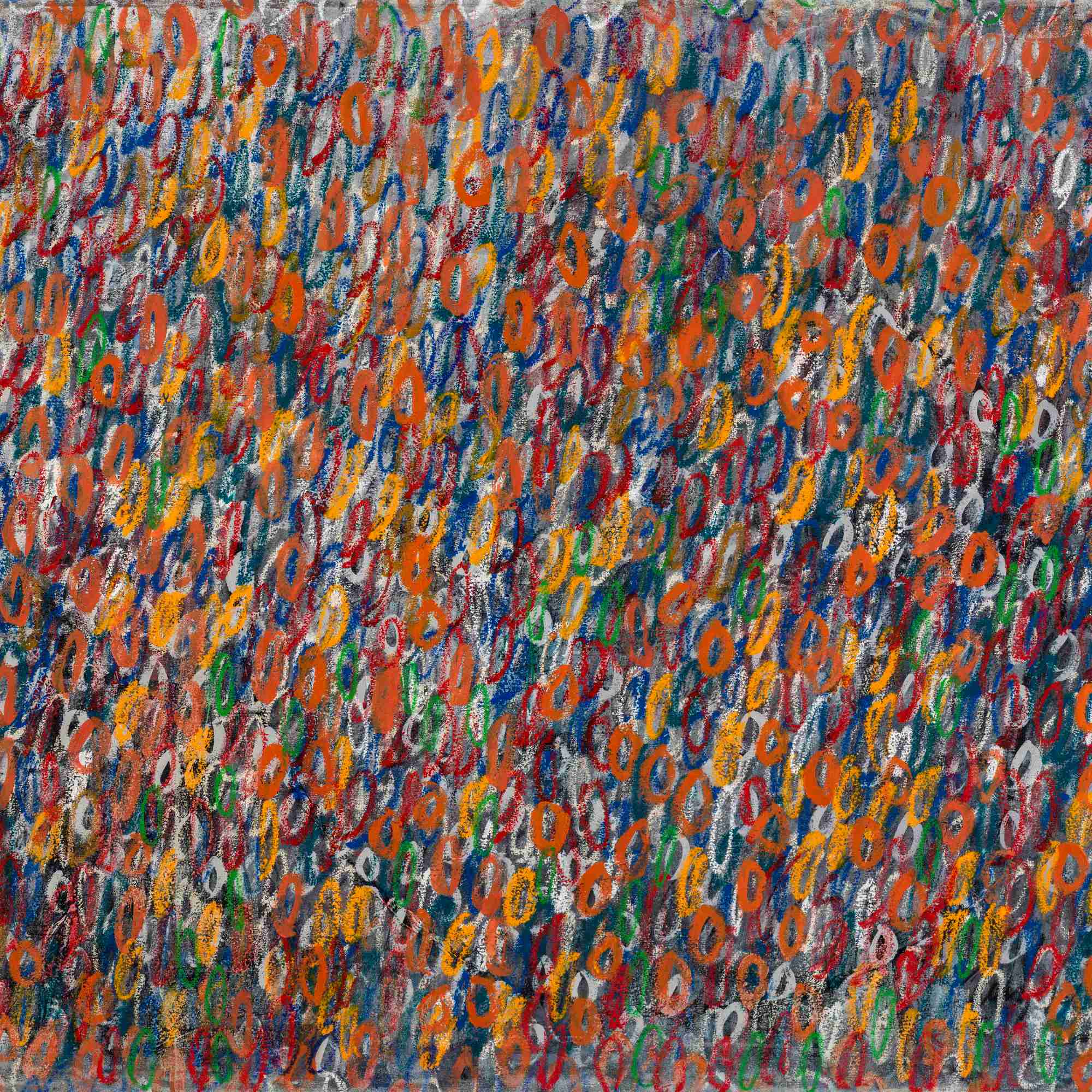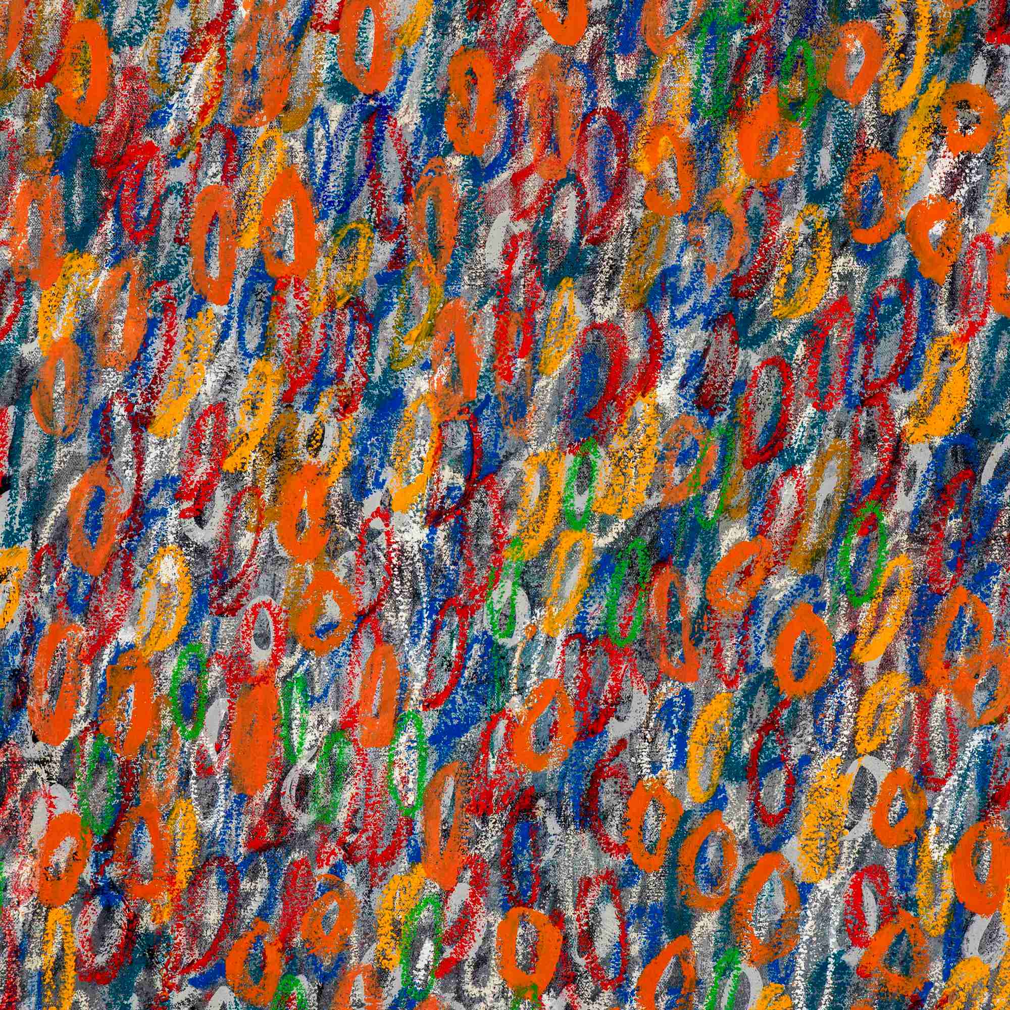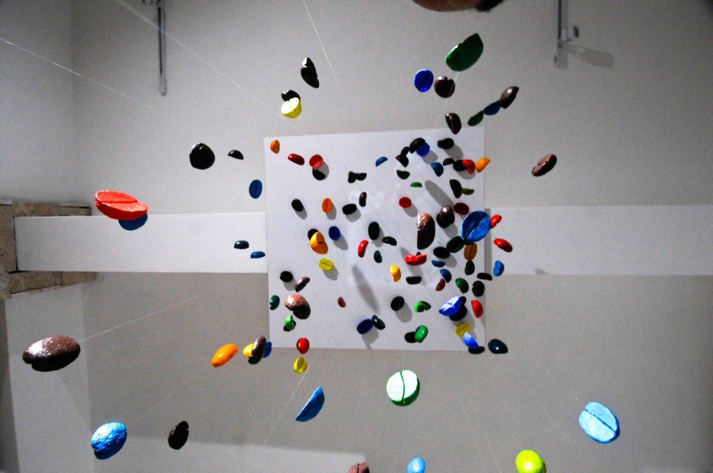 Luz Severino nos da a entender esta dimensión universal transcrita por el recurso a un producto tan compartido como el café, segunda mercancía comercializada en el mundo, tras el petróleo, aún más por el recurso a formas simplificadas para expresar lo esencial de una búsqueda común. Nos proporciona en efecto los óvalos de granos (o lágrimas ovaladas…) que tienden a convertirse en rayas verticales que hilvanan cielo y tierra, como una lluvia cafeinada que limpia, filtra y cuela las contaminaciones de nuestras sociedades modernas; y los compagina con los cuadrados de nuestros encerramientos y bloqueos, de nuestros rechazos de reparto así como los círculos o vasijas a donde cae el café, microcosmos de un mundo en espera.