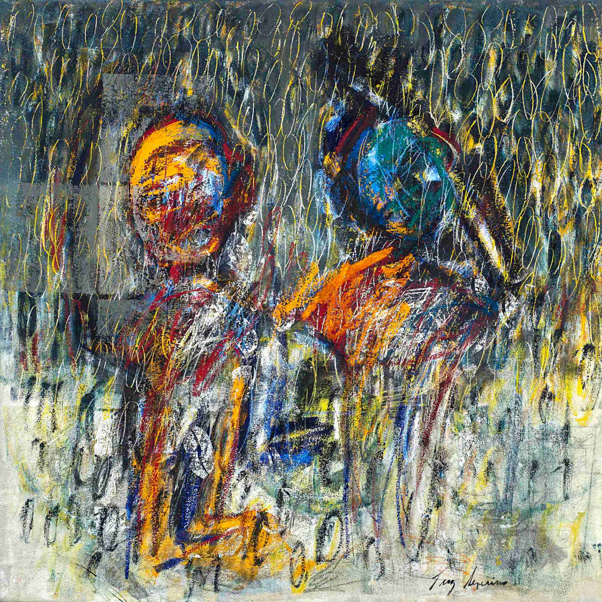 Ojalá que llueva café para que podamos unir tierra y cielo, hilvanar vida y muerte, en una verdadera empatía con el mundo que nos rodea y los seres humanos tan presentes en esta exposición, en su imponente y corpórea abstracción, sus deslindes oscuros como el café tostado que contrastan con los naturales colores vivos y variados que los cubren y entretejen así los ásperos días de un cotidiano sin máscaras. Por ser todos idénticos y distintos a la vez, invitan a trascender las diferencias en una evocación de lo universal y de la común dimensión humana.