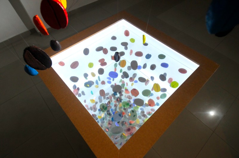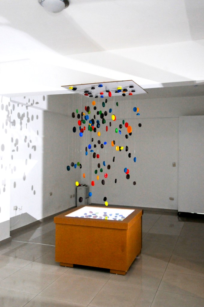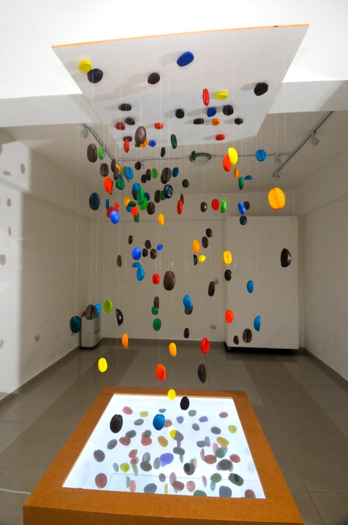 La instalación con su gran caja donde se atesoran los granos de café que no se comparten con la población sedienta hambrienta, física y espiritualmente, simboliza a su vez con sus juegos de espejos y luces esta llamada ecosocial con granos de café, a la par separados y unidos como otros tantos vínculos posibles.